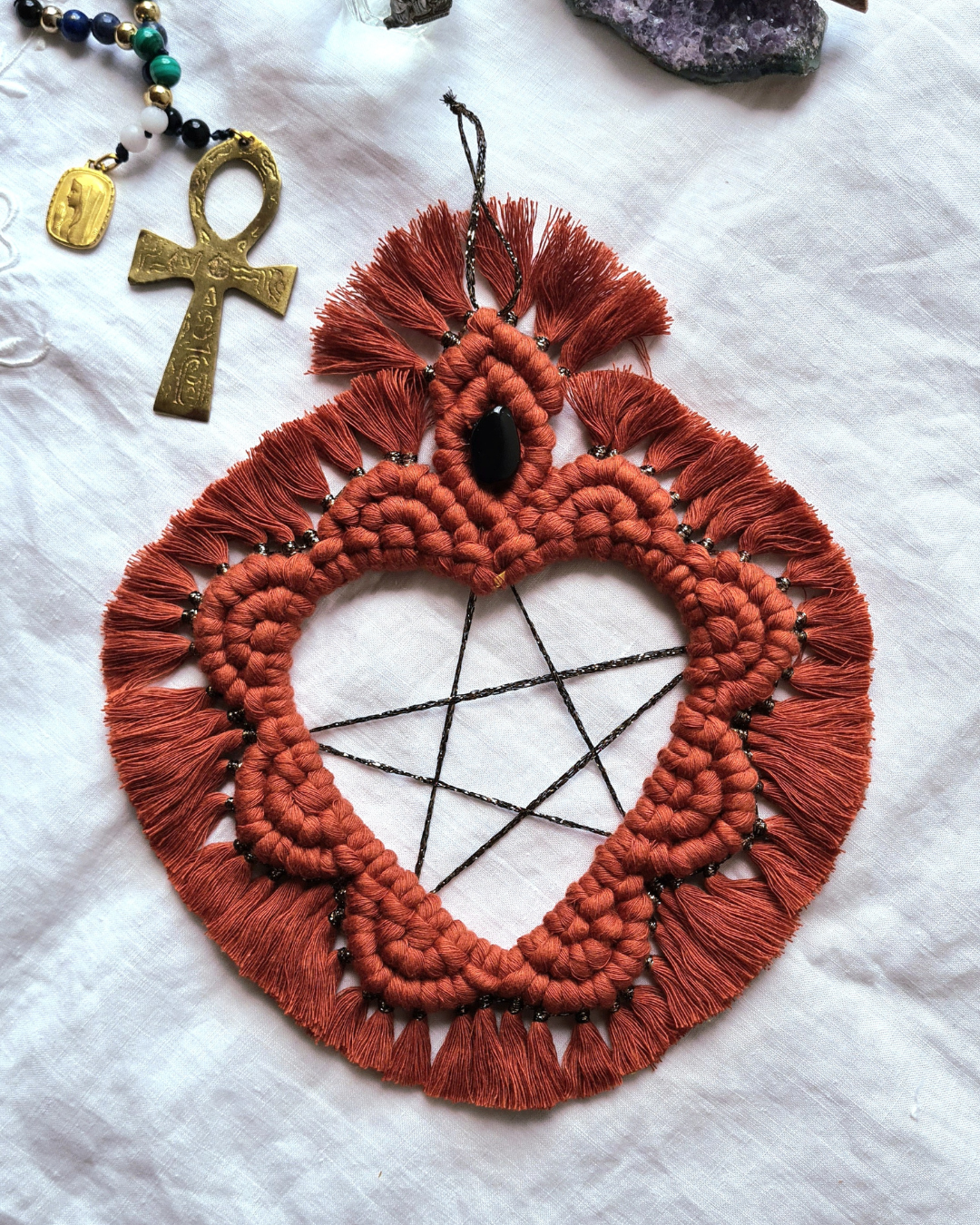 Ex-voto tissé avec coton recyclé couleur terracotta, fil lurex noir doré, pierre obsdienne.