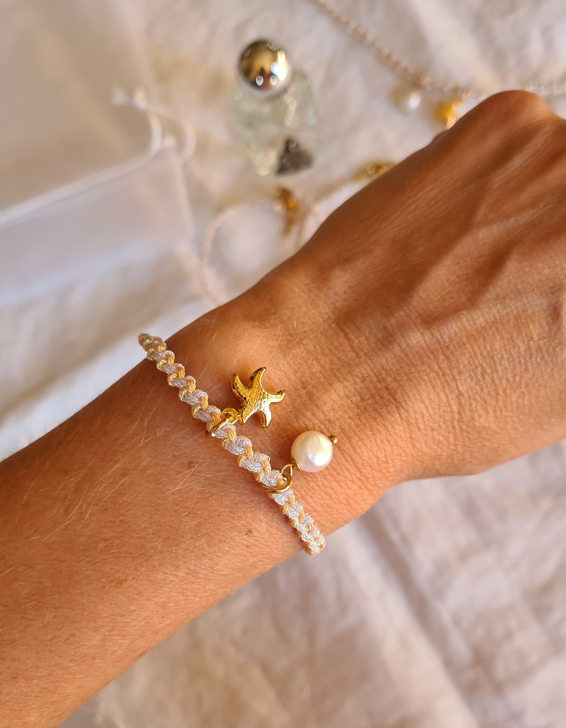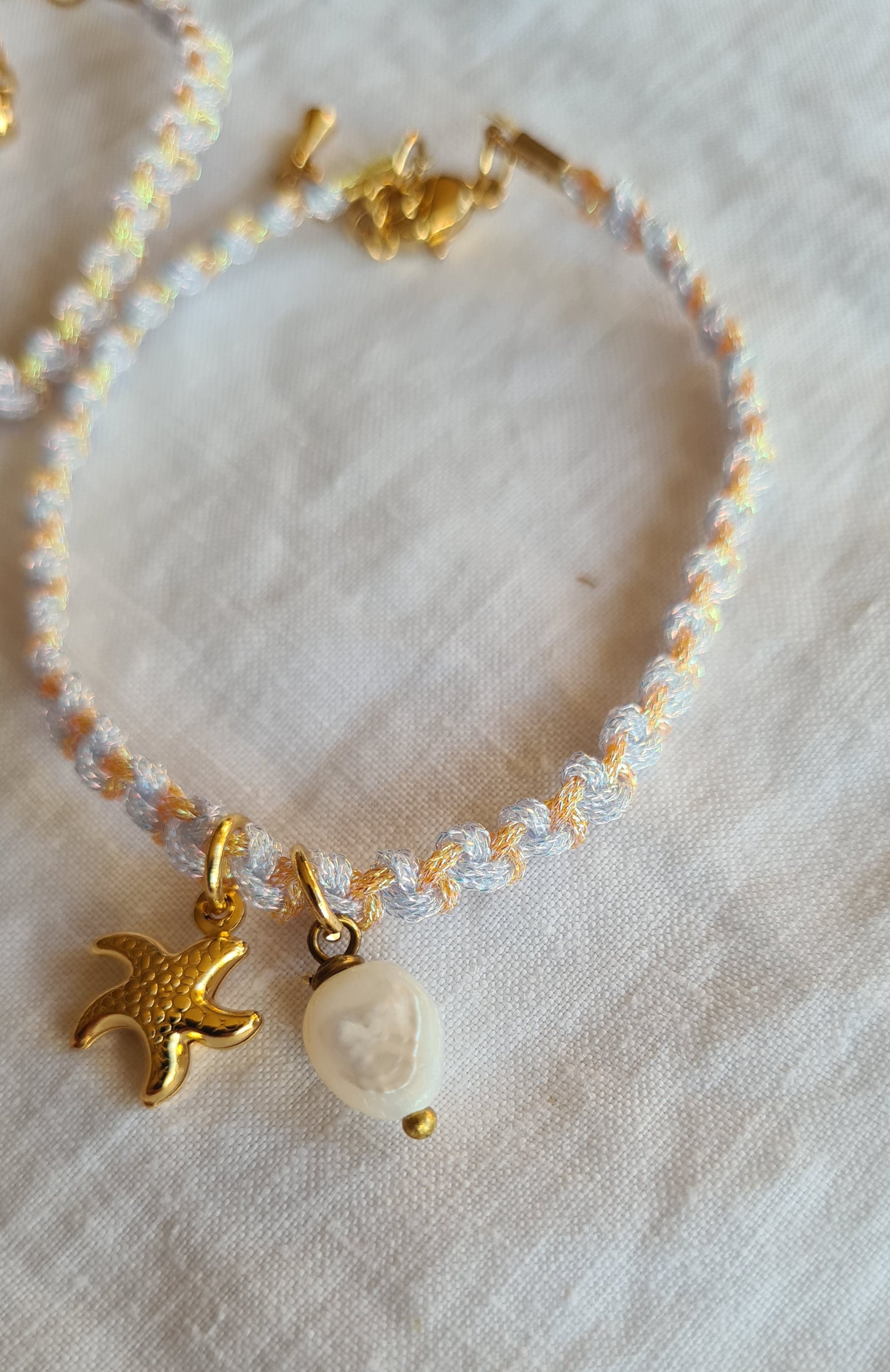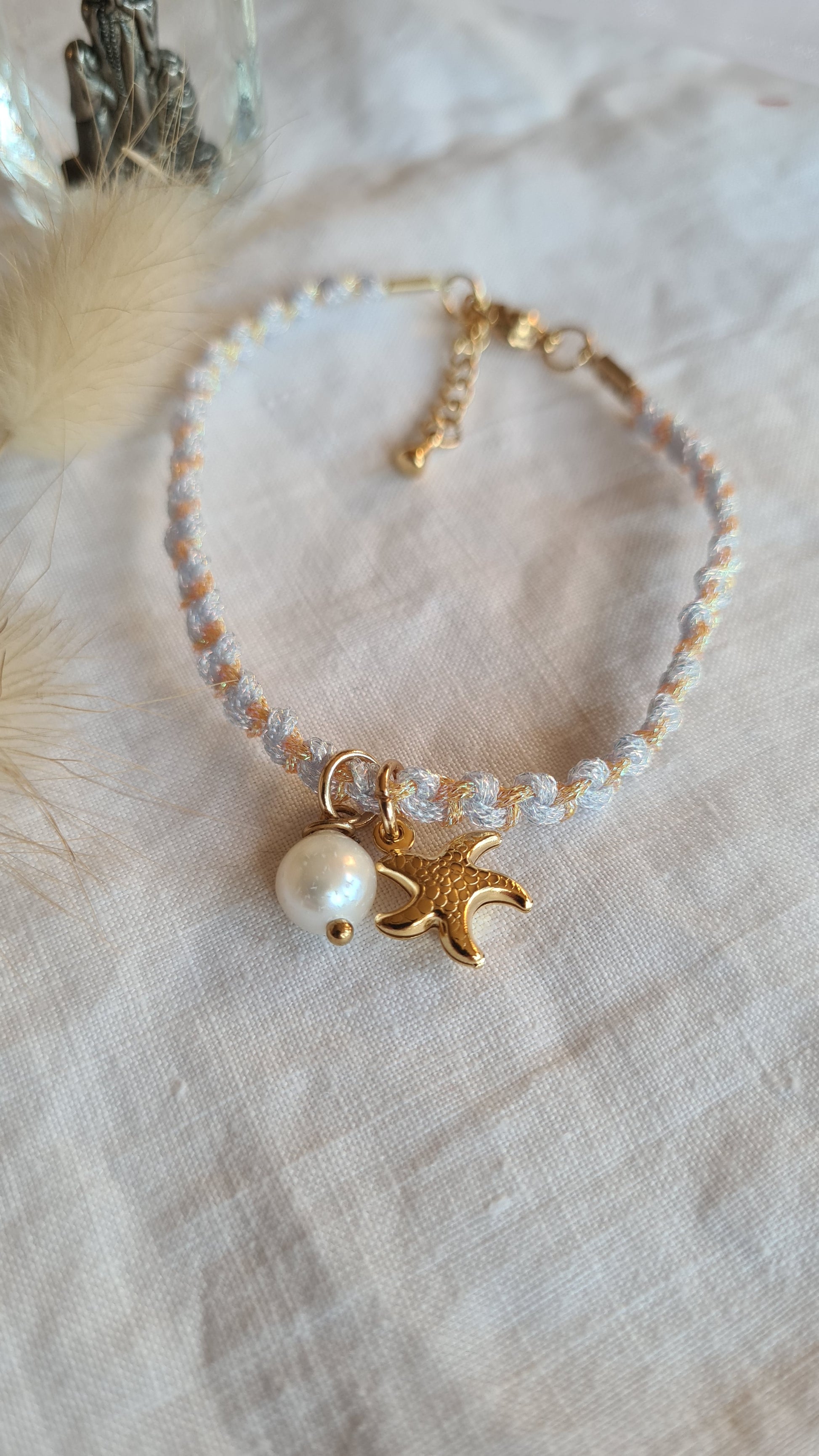 Composé de deux fils lurex (doré et turquoise), il incarne la clarté émotionnelle, l’ancrage et la douceur. Ce bracelet fin est orné d’une perle d’eau douce naturelle et d’une breloque étoile de mer dorée en acier inoxydable.